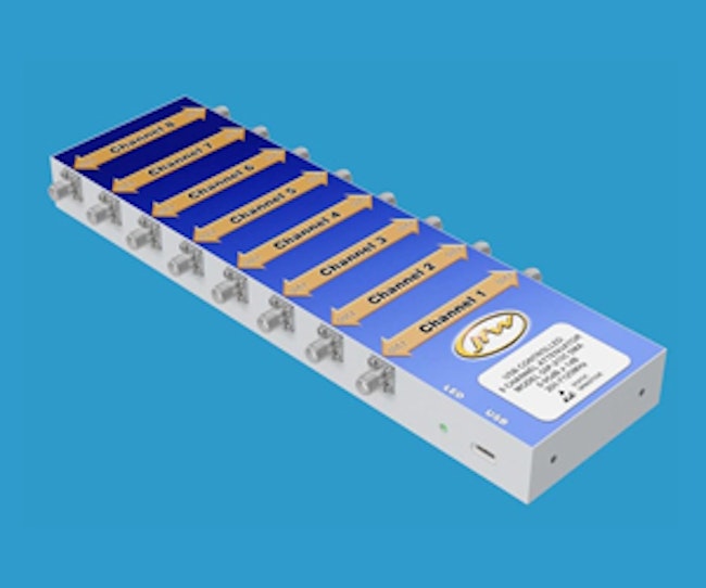 JFW model 50P-2155 SMA is an 8 channel programmable attenuator with USB control. It operates from 200-7125Mhz with attenuation range 0 to 95dB by 1dB steps. All eight attenuators are individually controlled. Test software is provided with the USB attenuator. If you would like to integrate the USB attenuator into your script testing, we do offer a JFW Python library upon request.