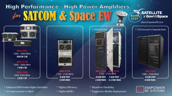 Engineered for demanding SATCOM ground stations, we offer a family of rugged air‑cooled SSPAs and advanced liquid‑cooled systems for extreme output power. Our technology leading liquid-cooled transmitters are scalable and modular. Visit us at Satellite Show, booth 1127 and ask about our optional linearizer which provides a tight spectral mask, improves EVM, and lowers crest factor.